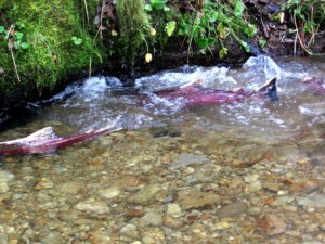 Anyway, Baldy looks somewhat young. He’s big, as they all seem to be out here, but he just looked younger in his coloring and feathers. He sat in that tree for over an hour, flew to a high branch around the corner to the left from his first spot, then he decided the creek (Boxler Creek, a salmon habitat project) looked interesting just below him.