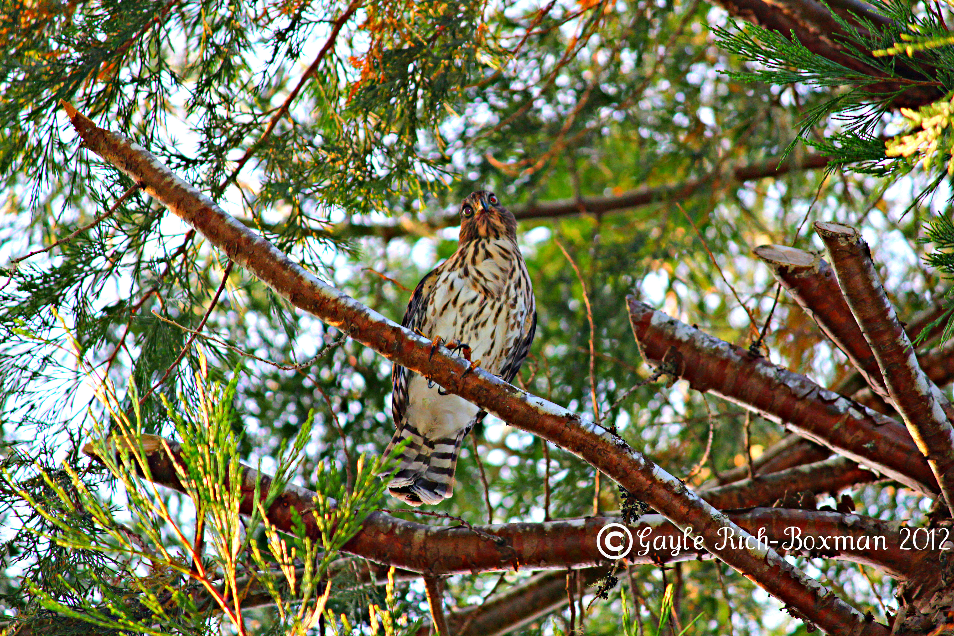 I got a set of photos of a bird that I later found out is a Cooper’s Hawk. He was flushed out by my dogs just two doors down from my home here at Fishhawk Lake and flew into a high set of branches above my head. I got this photo of him when I did a smooching sound and he looked right at me, cocking his head to one side. After I took the photos I had to do some research to discover what he was!