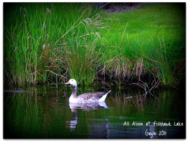 This goose used to be part of a threesome, but is all by itself until the Canadian geese fly through for winter or spring past Fishhawk Lake or stop by for a rest.